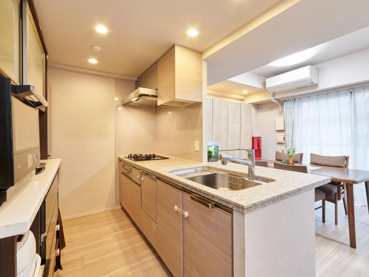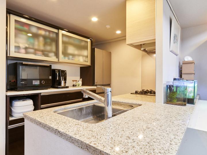 公営水道、都市ガス、公共下水、ガスコンロ、ペット相談、バルコニー有、追い焚き、システムキッチン、2階以上、エレベーター、フローリング、宅配ボックス、角部屋、床暖房、モニタ付インターホン、温水洗浄便座、カウンターキッチン、浴室乾燥機、食器洗浄乾燥機、24時間換気