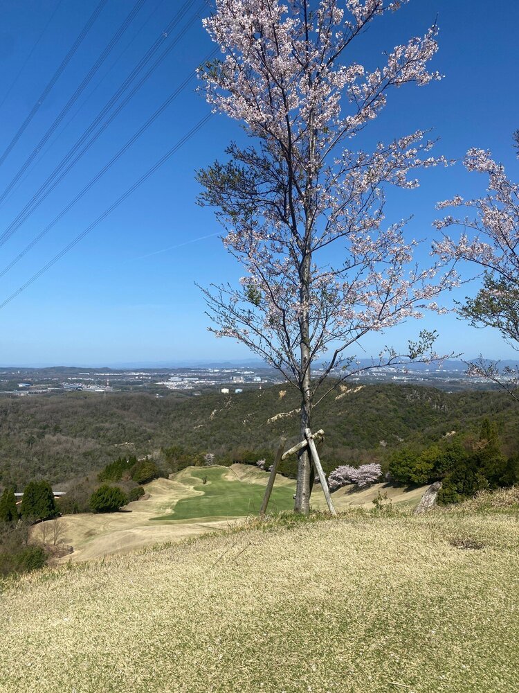 (写真はゴルフ場で撮影した、スタートホールと桜の写真です。コースの随所に桜が咲いており、とてもきれいでした。)