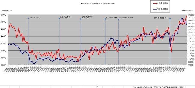 【市況情報】東京都全体の不動産平均価格と日経平均株価の推移 自由が丘店 自由が丘店のブログ 2021/08/27 東京都全体の不動産平均価格と日経平均株価の推移のグラフをリリースしました 東京都の不動産価格と日経平均株価が連動し推移していることが分かります。 リーマンショックや災害や政治等により、株価同様に不動産価格への影響は顕著に表れます。