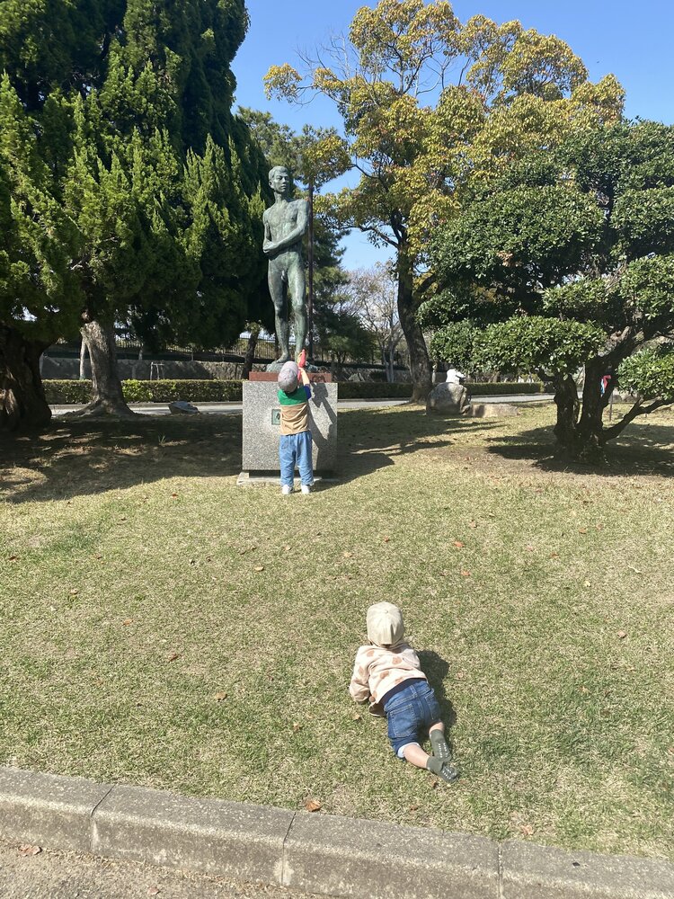 どこまでも這いずる男、銅像を見て「パパや」と叫ぶ男