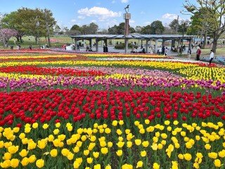 公園に着いた瞬間、色とりどりのチューリップが一面に広がっていて、